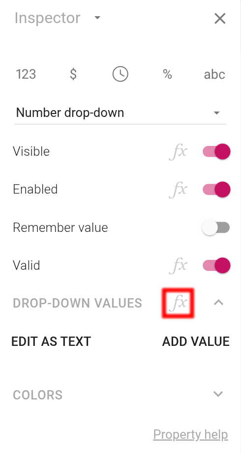To associate a formula with the Values property, press the new fx button in the inspector: